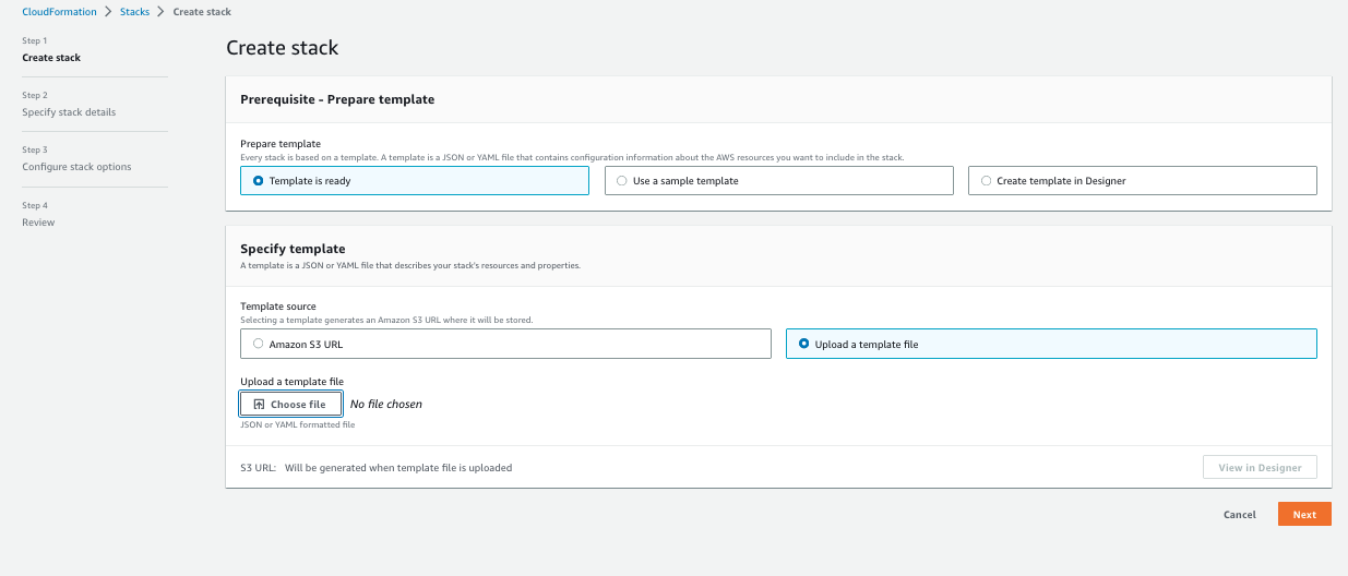 Scroll down and select “Upload a template file”, then select the new-vpc.template that was downloaded before.