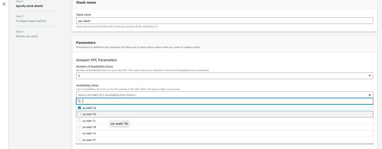 For Availability Zones, choose us-east-1a and us-east-1b.