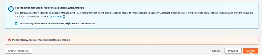 Check the box acknowledging that the template will create IAM resources and Click Create Stack