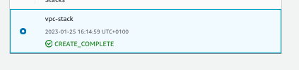 After 3-5 minute, reload the CloudFormation Stacks page. When the status of “vpc-stack” shows CREAT_COMPLETE, click the Outputs tab. Here you will see some of the resources that were created via the CloudFormation template, specifically the VPC and the related Subnets.