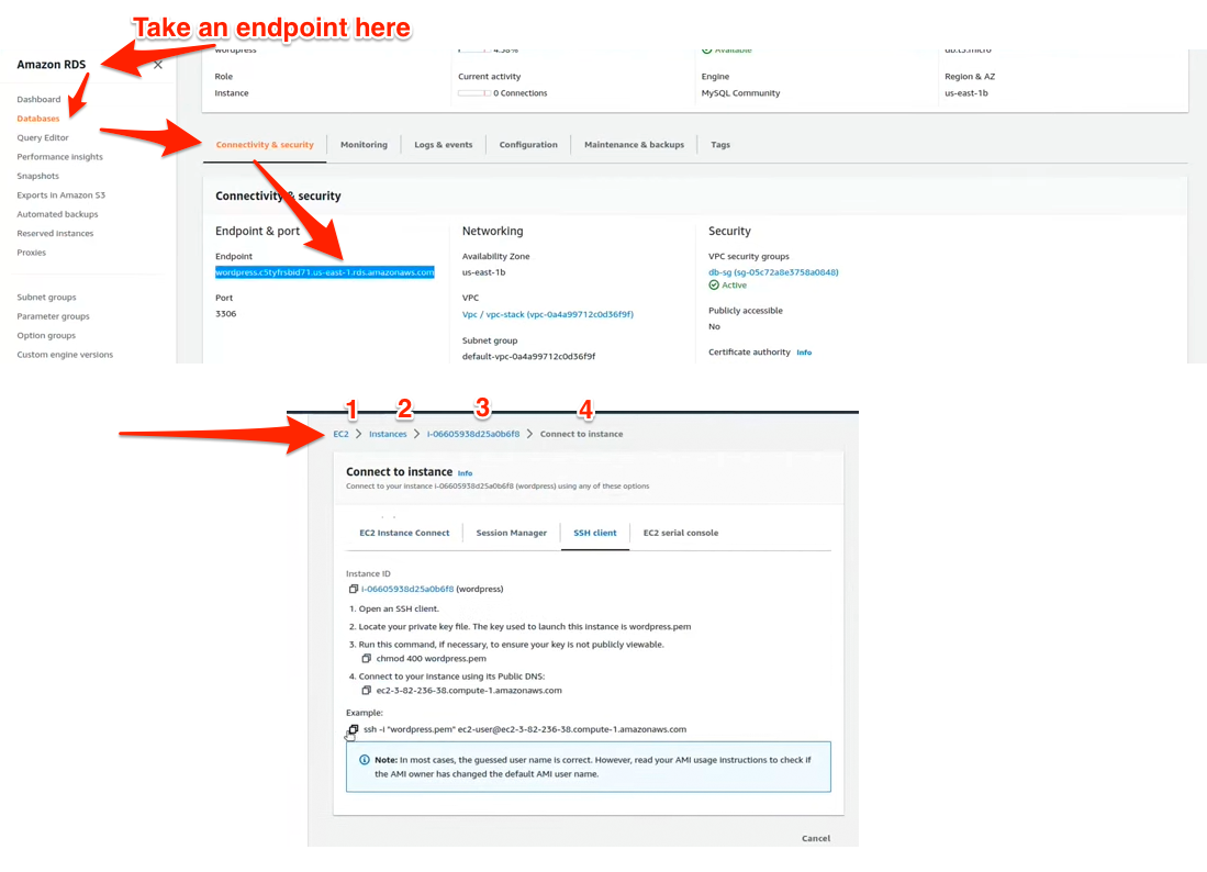 'wordpress''wordpress''wordpress-pass'For the database host, please use the endpoint address copied earlier.