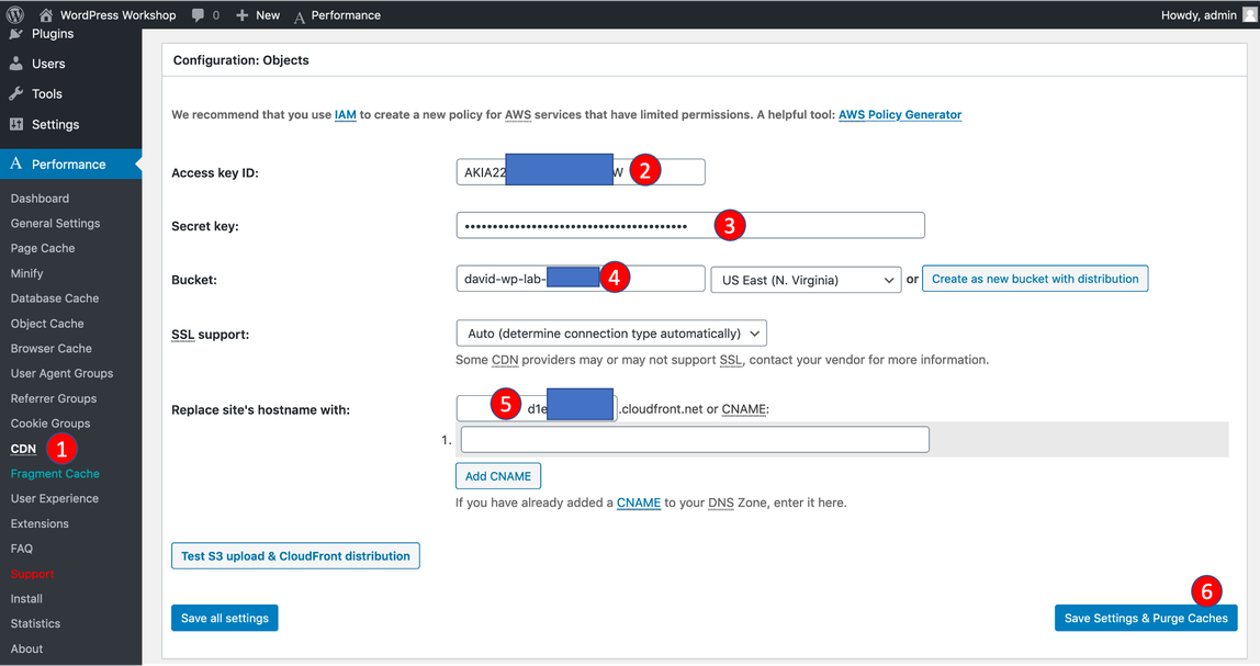 - For Replace site’s hostname with, enter the CloudFront Domain created in last step and click Save Settings and Purge Caches